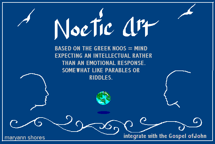The word "noetic" is based upon the Greek "noos" which refers to the mind. My Noetic Art is intended to stimulate thought, somewhat like a riddle does. These paintings are available for your use, to print out, project for discussion, for personal uplift, and other uses you may envision, as long as they are not changed in content.
